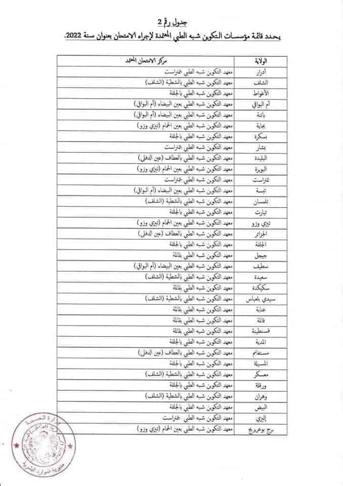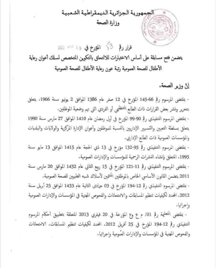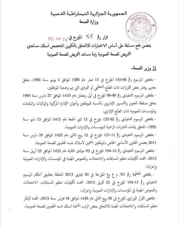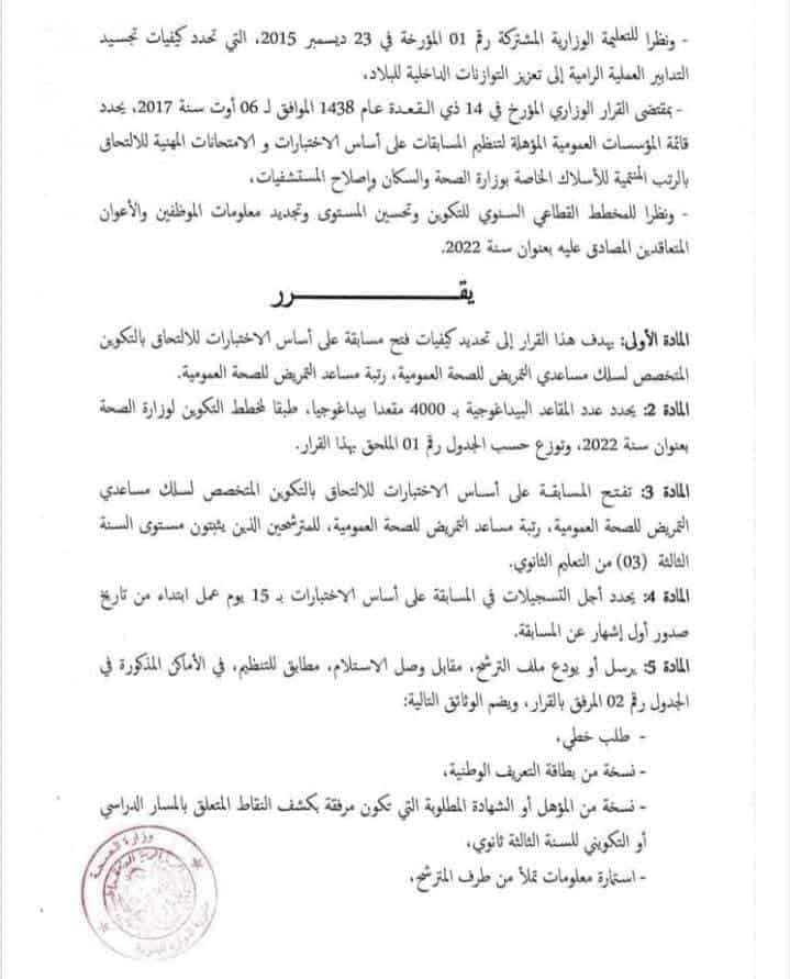 Le document stipule qu’un concours national sera organisé pour recruter du personnel au profit du corps des paramédicaux, plus précisément les aides-soignants, conformément au plan de formation du ministère.