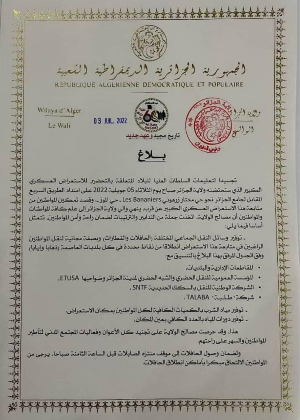 Pour faciliter le déplacement aux citoyens désirant assister à la parade militaire prévue demain mardi, la wilaya d’Alger garantira le transport gratuit.